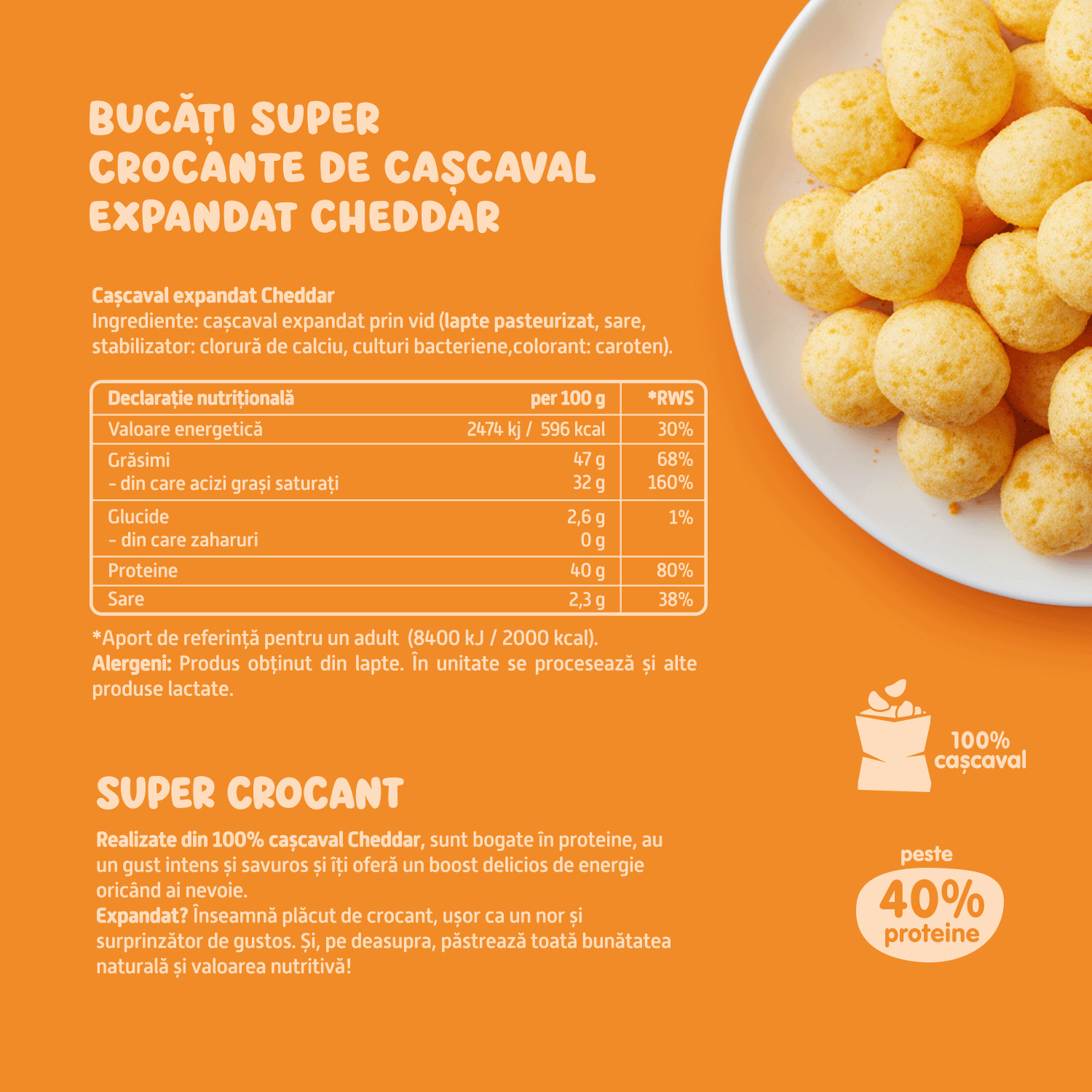 Realizate din 100% cașcaval Cheddar, sunt bogate în proteine, au un gust intens și savuros și îți oferă un boost delicios de energie oricând ai nevoie.